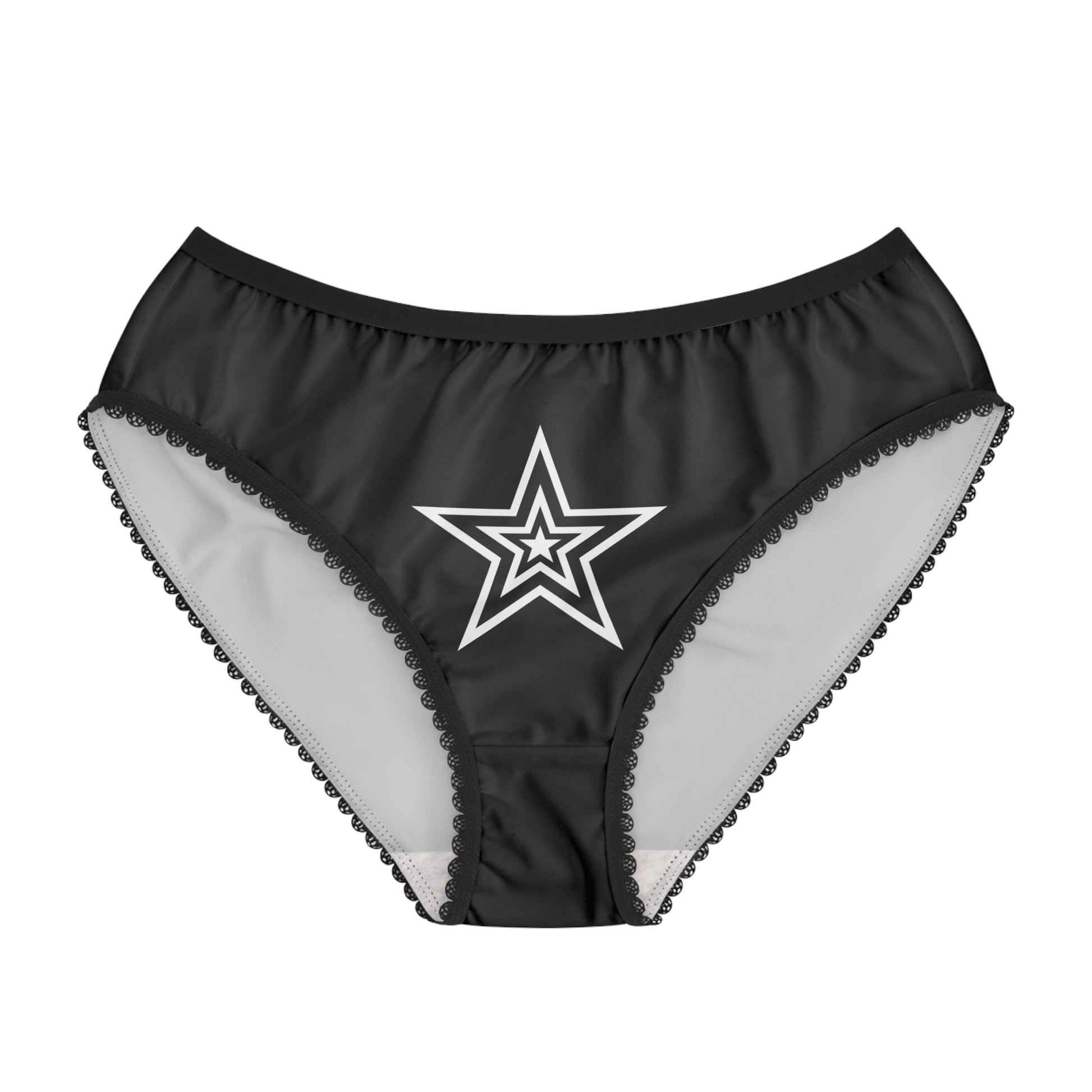 Soft, flattering briefs designed for everyday confidence. Lightweight polyester with a two-sided fleece finish feels smooth against the skin while keeping the printed colors vivid. A bold pink star sits centered on a deep black background for a playful, retro-inspired look. The low-rise cut and scalloped trim line create a subtly feminine silhouette you can wear under skirts or jeans. Stretchy elastic at the waist stays comfortable all day, and the printed care label keeps seams smooth. These briefs work as a small, spirited detail in your daily rotation — brightening a regular morning or adding a pop of personality for nights out.